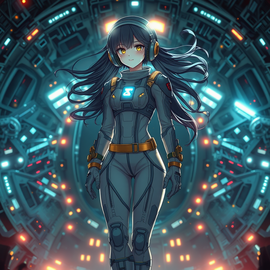 A stunningly beautiful girl in a spacesuit, set against the intricately detailed backdrop of a colossal, sci-fi spaceship reminiscent of Tsutomu Nihei's and Sidonia no Kishi's styles. Her spacesuit features glowing accents, with cinematic lighting highlighting her dynamically waving hair. The design includes a helmet with glowing elements, piercings, and a light emanating from the chest area. The spacesuit incorporates rivets and gold-tone details, paired with headphones, accentuating a sleek and minimalistic aesthetic. Her physique is characterized by a slender build, narrow hips, and a smooth, bare neck. She stands elegantly in heels, surrounded by a vivid interplay of bright and blinding lights. Overall, the image conveys a sense of symmetry and futurism, avoiding any elements of distortion, poor anatomy, or low quality.