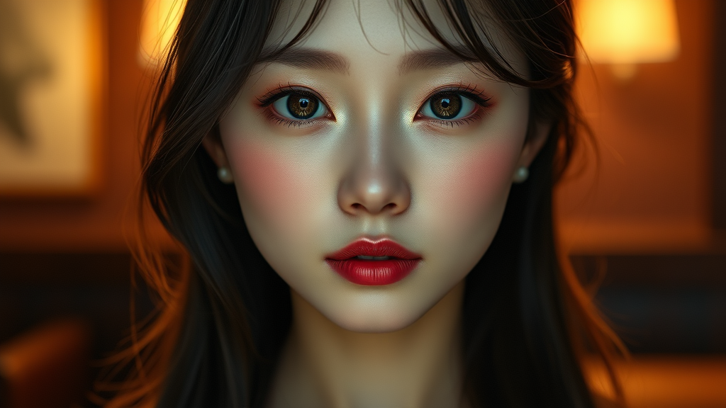 A stunningly beautiful Korean girl with exquisite, symmetrically detailed eyes is captured under dramatic lighting in a high-resolution photo. This professional, hyper-realistic image boasts rich colors, achieved with an f1.6 lens, and presents lifelike textures reminiscent of an 8K CGI rendering. Inspired by Cinestill 800, the photo illustrates a blend of realism and hyperrealism with a focus on perfect proportions. Yet, it subtly imbues the digital artistry of illustrations and drawings, imparting a touch of character akin to anime or cartoon styles. Enhanced with vibrant colors and a detailed background, the girl's flawless skin and elegant features are highlighted, creating an image of photographic excellence without imperfections, maintaining a deep sense of realism in its essence.