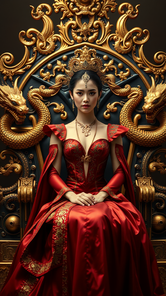 A stunningly beautiful queen seated gracefully on a majestic black throne adorned with elaborate gold serpent-dragon motifs, each detail intricately crafted. The setting is illuminated with dramatic, cinematic lighting, enhancing the hyperrealism and photorealistic quality of the scene. Shot in exquisite 8k resolution, the image captures the regal aura and expressive style, akin to a masterpiece rendered in an advanced digital engine, maintaining a 9:16 aspect ratio with slight creative embellishments to bring the fantastical vision to life.
