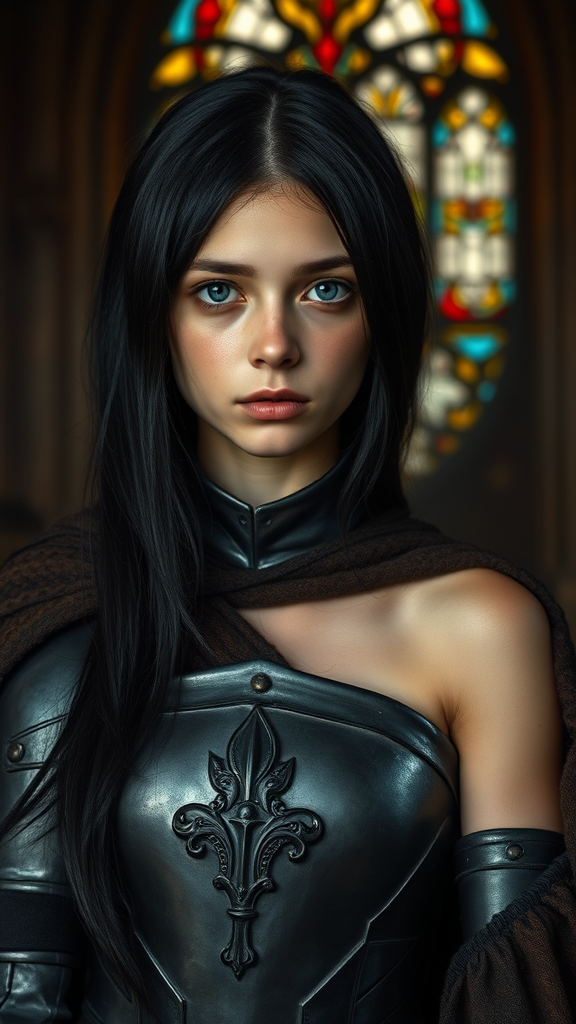 A stunningly beautiful slender girl in a dark fantasy film style is portrayed in a three-quarter close-up. She has a naive and innocent face framed by long black hair. Her shabby black knight armor is made of blued steel, reflecting an eerie charm. She wears a superbly detailed tattered dark brown wool cloak with a coarse weave that adds to the character's mysterious allure. The background is dramatic and features stained glass with a gloomy and scary atmosphere, setting an expressive mood with natural funnel textures. The scene is hyper-photorealistic, utilizing natural daylight and stained glass lighting to highlight the natural reflections and textures. Cinematic lighting enhances the ambiance, accentuating symmetry. Despite the haunting setting, there is an essence of grace in her exposed arms and neck, making a bold contrast against her protective gear. This composition is vivid and detailed, carefully avoiding any disfigurements or anomalies, ensuring a harmonious and captivating image.