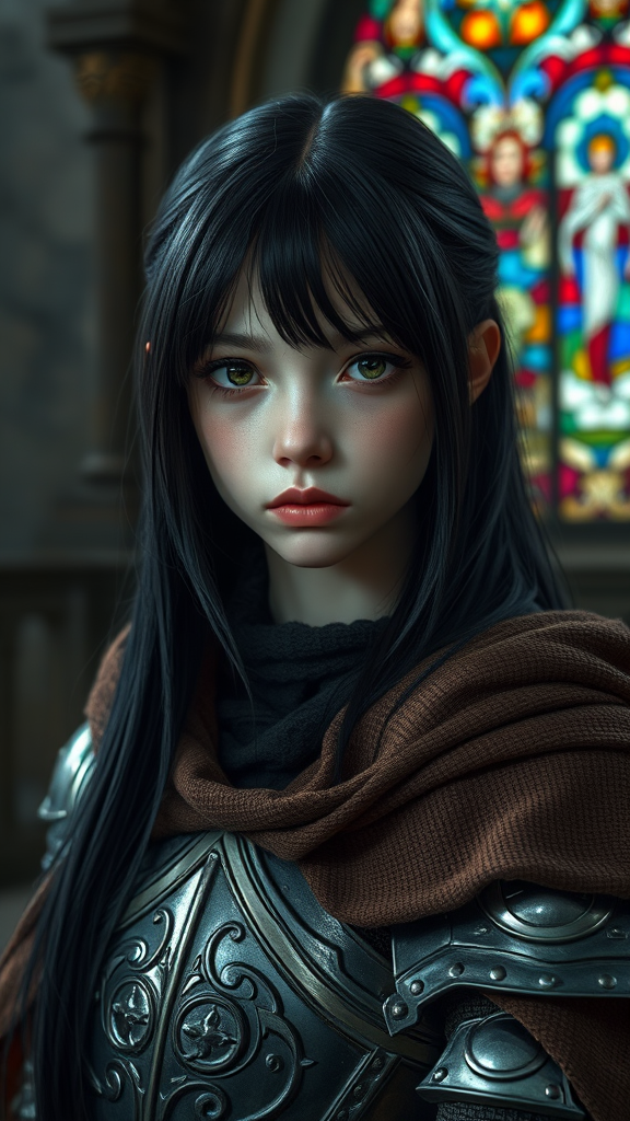 A stunningly beautiful, slender girl with an innocent face and long black hair is portrayed in a three-quarter close-up. She wears shabby, blued-steel knight armor, accompanied by a superbly detailed tattered dark brown wool cloak with a coarse weave. The dramatic background features stained glass, creating a gloomy and eerie atmosphere with natural funnel textures, expressive details, and hyper-realistic elements. The scene captures natural daylight and reflections, showcasing intricate textures and stained glass lighting that enhances color illumination. The cinematic lighting emphasizes symmetry and anime-style eyes, while avoiding any depiction of deformed anatomy, distorted features, or unnatural proportions, ensuring a harmonious and captivating visual narrative.