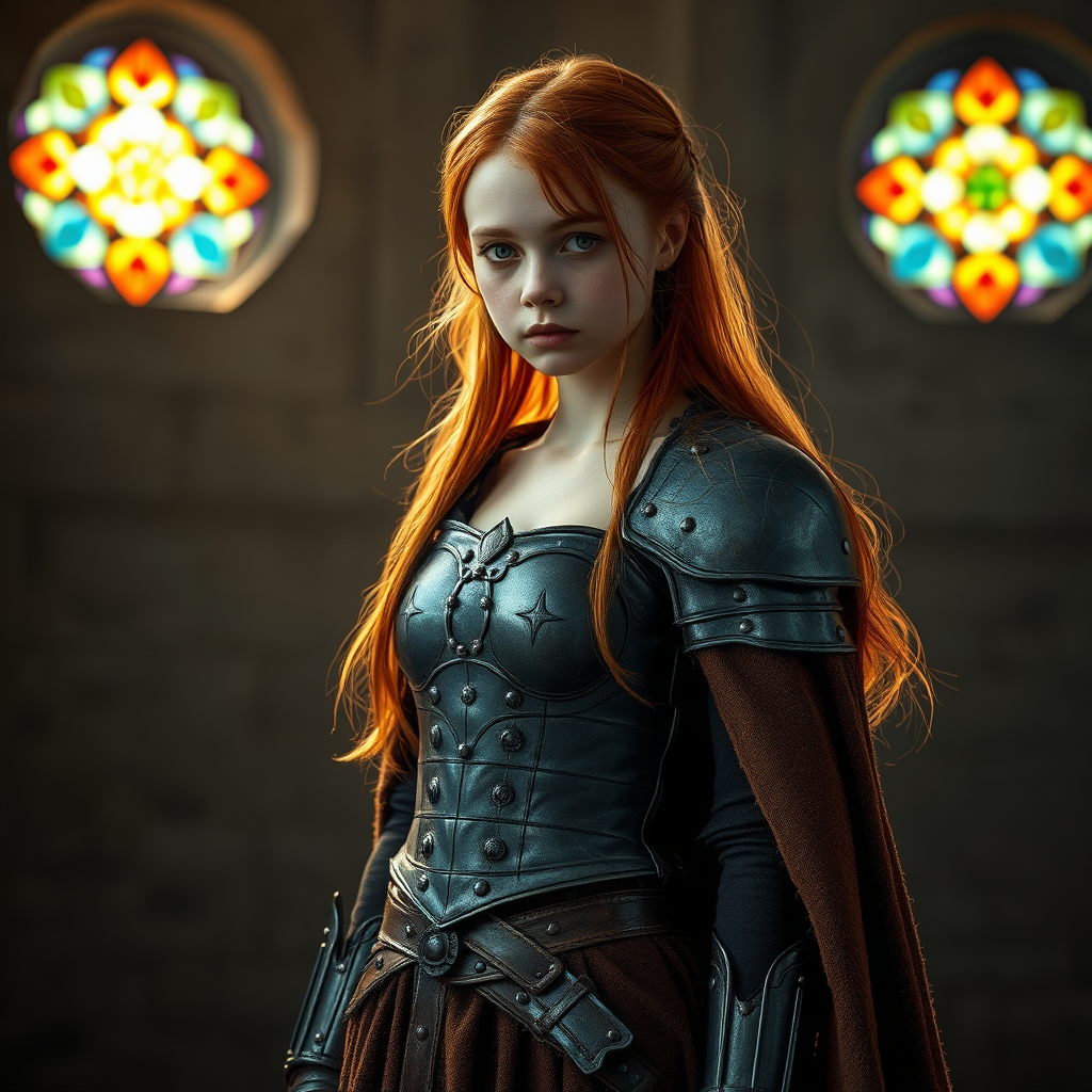 A stunningly beautiful, slender girl with fiery red, long hair and an innocent face, wearing intricately detailed damaged gothic knight's armor made of blued steel. Her ensemble features tights paired with a short skirt, and she's draped in a superbly detailed, tattered dark brown wool cloak. The atmosphere is dramatic, with a gloomy, frightening background, while the natural textures and reflections enhance the natural blued steel texture of her armor. The scene is captured during the golden hour, with cinematic lighting, stained glass lighting creating colored glass effects, and bright, blinding light adding intensity. The girl's attire is completed with a corset adorned with rivets, embodying a touch of gothic elegance. She stands amidst an expressive background, her animated eyes hinting at a naive yet determined spirit. Avoiding any disfigurements, the image remains clean, capturing her ethereal beauty in a hyper-realistic style, without any signs of mutations or distortions. The natural light shines through round windows, casting circular reflections, as her naked neck and hands add to her mystical appearance, bringing life and intrigue to the scene. Her expression is vivid, contrasting with the brooding environment.