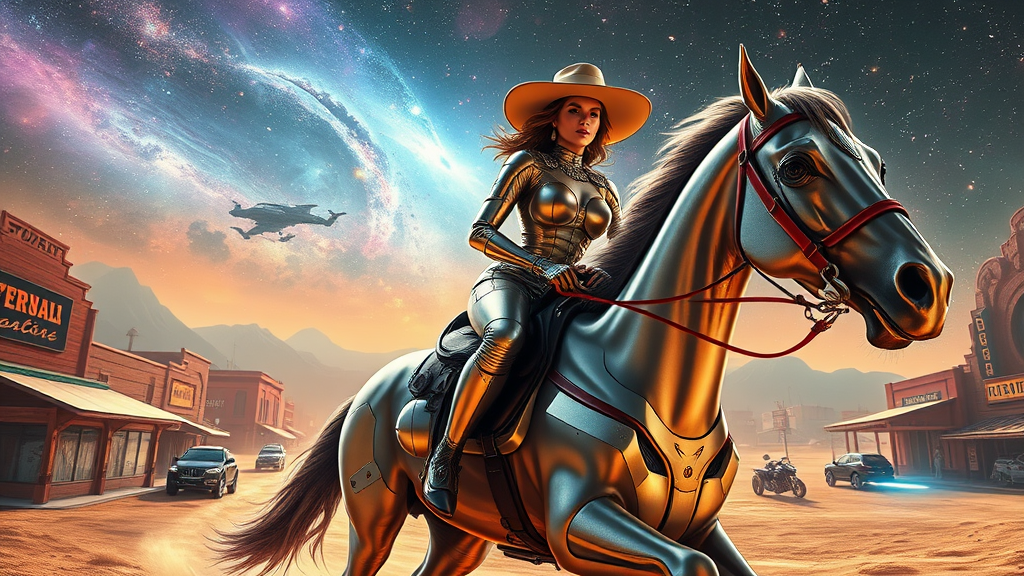 A stunningly beautiful space cowgirl gallops through a cosmic frontier, her shimmering suit reflecting the vibrant hues of distant nebulas, riding a sleek, cybernetic horse enhanced with futuristic tech. The landscape combines elements of a wild west town with advanced space age technology, featuring glowing signs and hovering vehicles. Her wide-brimmed hat casts a shadow over determined eyes that gaze into the horizon, while a laser lasso hangs from her belt, ready for any adventure. Every detail is captured with ultra-realistic precision, as if in an 8k photograph, drawing viewers into this enchanting, high-definition sci-fi wild west era.