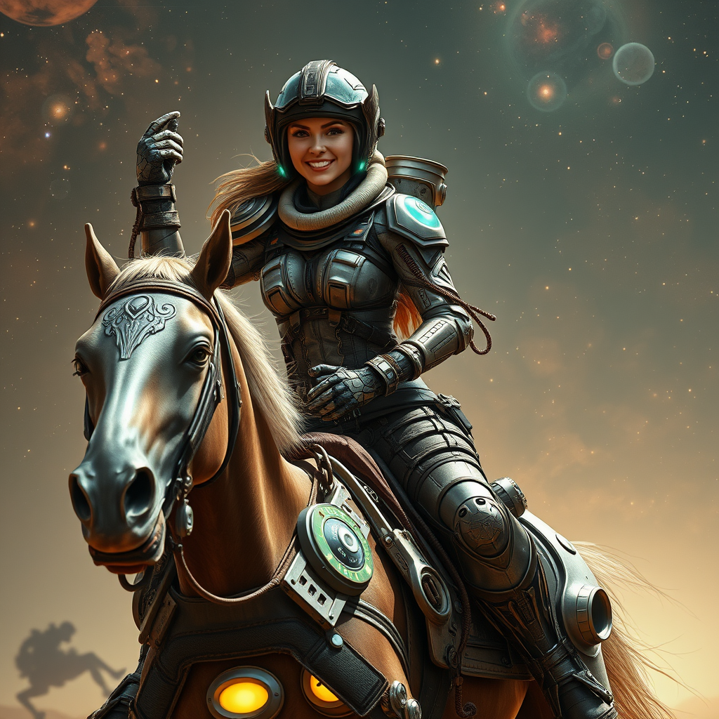 A stunningly beautiful space cowgirl with intricate details in her futuristic attire, adorned with glowing accents, rides triumphantly on a biomechanical horse. The scene blends the gritty charm of the wild west with high-tech, space age elements, set against a backdrop of distant stars and nebulae. Her attire is a fusion of traditional cowboy gear and advanced space technology, featuring a sleek helmet and a utility belt filled with high-tech gadgets. Her expression exudes confidence and determination, while the cybernetic horse adds a touch of realism with its lifelike movements and mechanical enhancements. The image captures the essence of a wild west sci-fi adventure in ultra-realistic detail and high definition clarity.