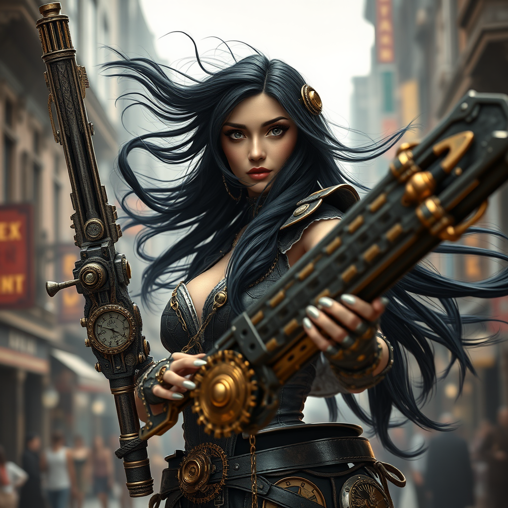 A stunningly beautiful steampunk woman with flowing jet-black hair, dressed in an intricately detailed steampunk ensemble, wielding a unique steampunk weapon; the scene captures a hyperrealistic and photorealistic essence with an 8k resolution, using unreal engine. The aspect ratio is tall and narrow, offering a dynamic and expressive style, highlighting elaborate gears and brass elements in her attire, set against a backdrop of a bustling steampunk cityscape, evoking a sense of adventure and mystery.