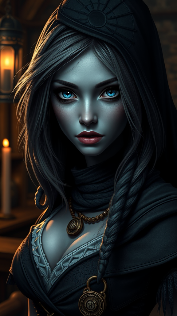 A stunningly beautiful thief from the D&D Circle of Stars, featuring striking eyes and a full body character portrait. She is a dark fantasy figure with a detailed and realistic face, depicted in a digital portrait style. She resembles a Fiverr D&D character, embodying the elegance of a beautiful female Drow with her signature gray skin. She is dressed appropriately for a Medieval Tavern background, surrounded by moody lighting that adds to the dramatic atmosphere. This scene is captured in high definition, offering 8k UHD and HDR quality. Her appearance may give a hint of duplication or mutation, with unique features such as a long neck and extra fingers, creating an intriguing yet subtle altered aesthetic. The focus remains on her face, avoiding any out-of-frame elements, blurriness, or visual distractions like jpeg artifacts or watermarks. Characterized by both beauty and mystery, she embodies the allure and enigma of a D&D universe.