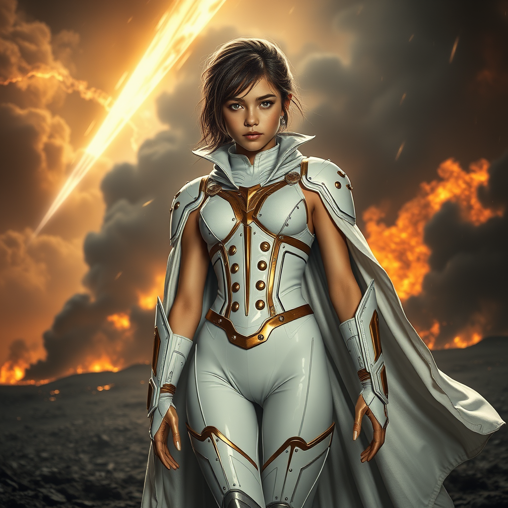 A stunningly beautiful young girl with a slender, athletic figure and an aristocratic face stands confidently, showcasing an intriguing blend of arrogance and innocence in her expression. She is adorned in glossy, sci-fi-inspired battle armor reminiscent of styles seen in Ghost In The Shell, featuring a tight white jumpsuit with armored leggings and a dense, flowing cloak. The scene unfolds amidst a dramatic meteor shower, with black smoke arising from distant fires against a backdrop of thunderclouds and reflections of the fiery chaos. The atmosphere is intensely dramatic and crushing, filled with hyper-realistic details, natural reflections, and textures highlighted by stained, cinematic lighting. Enhanced by blinding light, her outfit includes a golden corset with symmetrical rivets. Her look is further characterized by bare arms, neck, and chest, creating a striking contrast to the tech-enhanced armor. The setting is detailed and immersive, without imperfections like distortions or duplications, capturing an otherworldly yet realistic vision without any visual flaws or extraneous elements.