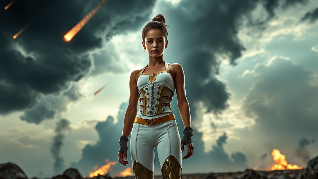 A stunningly beautiful young girl with an aristocratic face and a slender athletic build stands in a sci-fi setting, wearing a tight white jumpsuit with armored leggings. Her expression is a mix of arrogance and innocence. The scene is set against a dramatic, expressive background with a meteor shower, black smoke, thunderclouds, and reflections of fires creating a gloomy atmosphere. The girl’s hair is styled uniquely, adding to her striking appearance. She is framed from below, as if captured by a Canon EOS 5D Mark IV DSLR using a f/8 aperture, a 1/250 second shutter speed, and ISO 100, emphasizing super detailed hyperphotorealism with natural textures and cinematic lighting. Her attire includes a gold corset with rivets, and she stands with bare arms, neck, and chest, portraying strength and elegance. The scene’s lighting is bright and blinding, enhancing the contrast of the girl’s form and the formidable environment around her. The setting is devoid of distractions such as watermarks, distortions, or unrealistic qualities, focusing on a vivid and immersive portrayal.