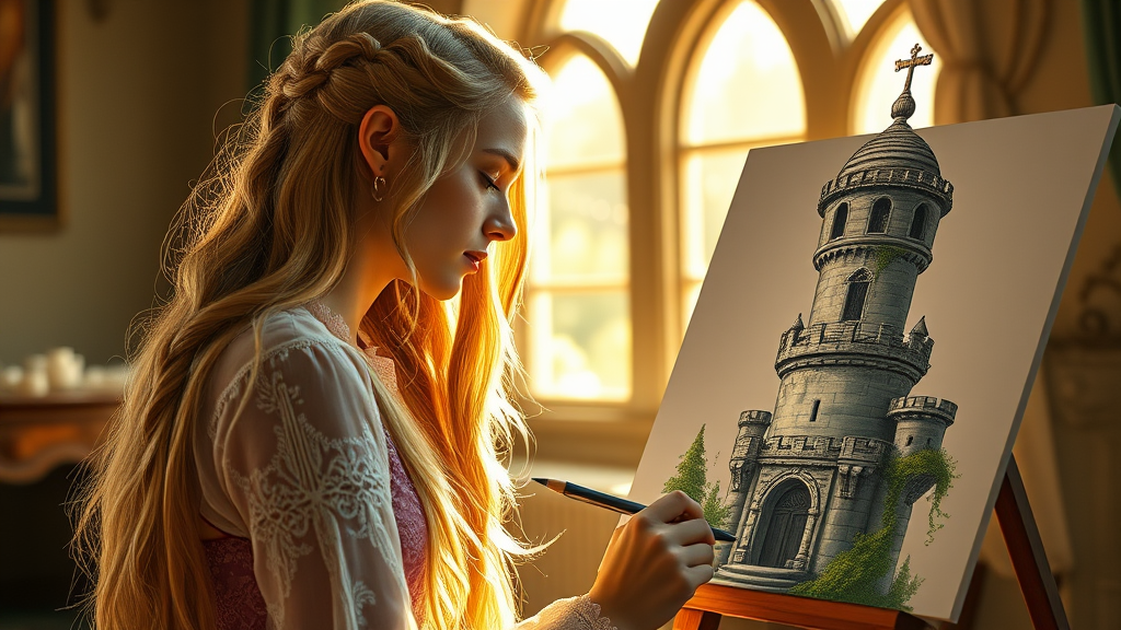 A stunningly beautiful young woman with flowing honey-blonde hair styled in an intricate braid, resembling Rapunzel from Tangled, is sitting in a serene, sunlit room. She is intensely focused, sketching a detailed portrait of her enchanting stone tower, with delicate ivy creeping up its walls. The scene is captured in ultra-realistic 8k resolution, with warm natural light streaming through an arched window, casting soft, glowing patterns on her canvas. The composition is epic and breathtaking, showcasing photorealism and the ethereal beauty of her artistic process, a masterpiece of creativity and light.