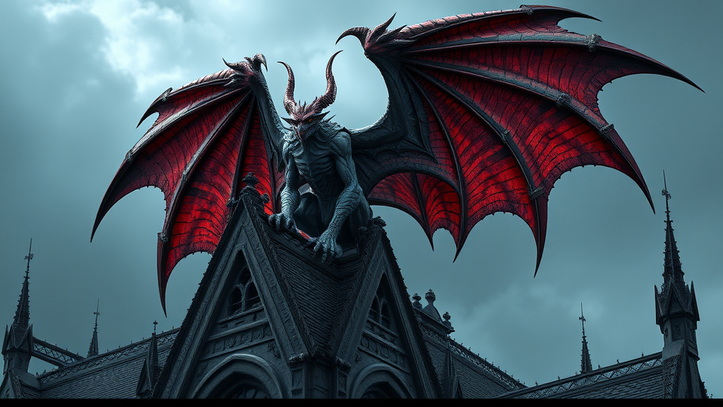 A stunningly crafted gargoyle with expansive, majestic wings and a strikingly beautiful form is perched in a captivating pose atop the roof of a grand dark Gothic castle. This hyper-detailed character concept art showcases a creature of strength and elegance, with creative and expressive anatomy, rendered in vibrant colors and a stylized design. This digital masterpiece combines the expertise of Adobe Photoshop, 3D Studio Max, and V-Ray to produce a unique and award-worthy piece in the glibatree style. The concept features a well-developed narrative and distinct personality, maintaining a consistent style throughout, crafted by the visionary talent of Artificial Nightmares.
