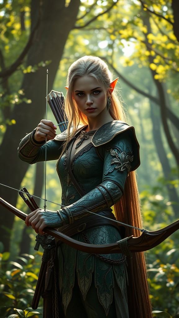 A stunningly detailed and captivating elven female archer stands gracefully in an enchanted forest, embodying the essence of a fantasy RPG world. Her intricately designed armor gleams subtly under the soft dappled light filtering through the dense canopy above. Each delicate leaf and vine pattern on her attire is rendered with hyperrealistic precision, reflecting her deep connection to nature. Her bow, crafted with exquisite care, seems almost alive in her hands. The dramatic lighting casts dynamic shadows, highlighting her poised yet fierce demeanor. Her eyes, sharp and mesmerizing, scan the vibrant woodland, anticipating unseen adventures akin to a Dungeons & Dragons campaign. The scene unfolds in cinematic quality, the realism captured in striking 8k resolution, immersing the viewer in a visionary experience.