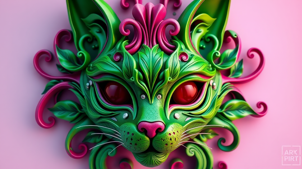 A stunningly detailed and ornate 3D sculpture of a vibrant green mask shaped like a cat's face, adorned with intricate and flowing twisting leaves, accented by fine, delicate lines. The design is abstract and psychedelic, capturing the essence of vivid colors in a mesmerizing closeup reminiscent of high-quality art displays, such as those found on artstation, with an 8k level of detail.