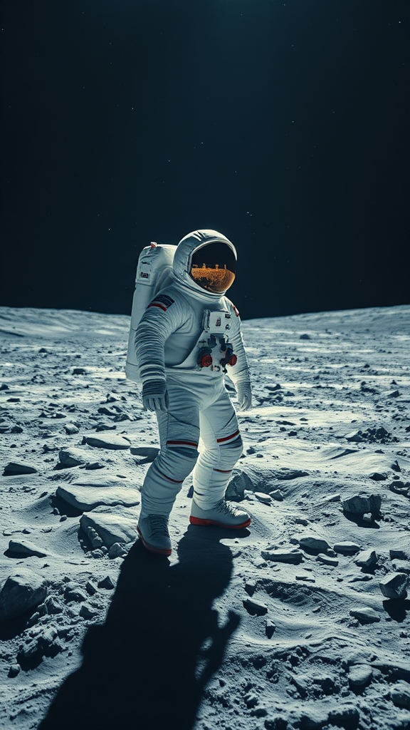 A stunningly detailed and sharply focused image of an astronaut standing on the desolate and rocky surface of the moon, surrounded by a vast celestial backdrop. The scene is captured in a cold color palette with muted hues of grays and blues, highlighting the stark contrasts of the lunar landscape. The astronaut's reflective visor subtly mirrors the infinite emptiness of space, while faint glimmers of distant stars dot the dark, expansive sky. Shadows cast by the astronaut create intriguing patterns across the uneven terrain, adding depth and realism to the otherworldly setting.