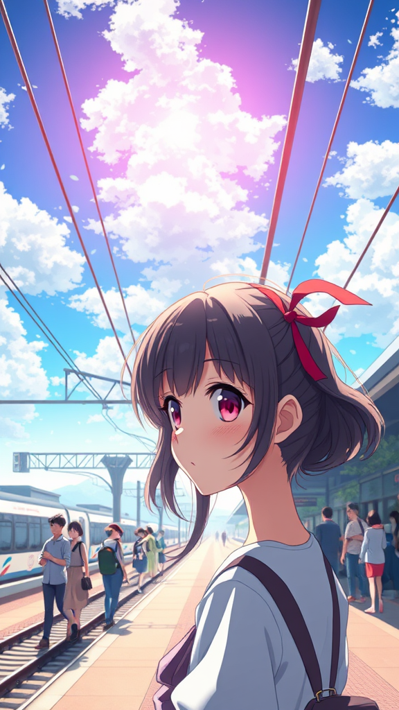 A stunningly detailed anime scene unfolds on a bustling train station platform, capturing the essence of a warm day under a brilliant azure sky dotted with fluffy clouds. At the heart of this vibrant setting is a pretty anime girl with an enchanting face, her hair adorned with vivid red ribbons that dance gently in the soft breeze. The entire atmosphere is suffused with soft focus and bright colors, creating a dreamlike quality reminiscent of Makoto Shinkai's work. The scene is alive with subtle details: passengers mingling on the platform, the warm sunlight casting gentle shadows, and the distant hum of a train approaching. The girl's eyes reflect a sense of wonder, as if she's on the cusp of an exciting journey or meaningful encounter.