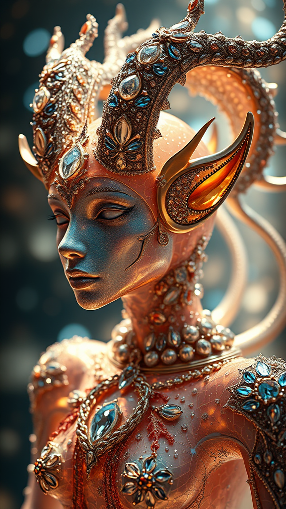 A stunningly detailed artwork of a human chimera in a biomorphic aesthetic, radiating luxury and opulence. The figure is adorned with Swarovski crystals and glistening gems, creating a captivating play of light and shadow reminiscent of works by Miho Hirano, James Jean, Roberto Ferri, Marco Mazzoni, and Karol Bak. The piece features cinematic lighting with glitter and bokeh effects, enhancing the ethereal ambiance. The composition is perfectly centered, with the subject gracefully positioned at a distance from the canvas edges, ensuring a balanced and harmonious view. Emphasizing a rich depth of field, the artwork captures the mesmerizing allure of intricate details, presenting a seamless blend of fine art and modern luxury aesthetics.