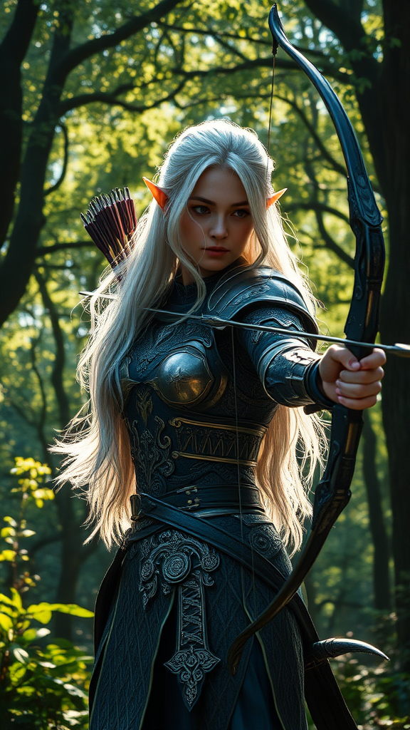 A stunningly detailed elf female archer stands poised in a lush, enchanted forest; her eyes keen and senses alert for the slightest rustle among the ancient trees. Her intricately designed armor gleams subtly in the dappled sunlight filtering through the dense canopy, embodying the essence of a master craftsman’s touch. Her silver hair cascades like a waterfall over her shoulders, catching the magical light. Every detail of her bow and arrows tells a story, etched with symbols of power and grace. The scene carries an air of a mystical saga, set in a world where RPG battles and epic quests of dungeons and dragons come to life. The cinematic atmosphere of hyperrealism is enhanced by dramatic, sweeping lighting that accentuates the photorealistic quality of this breathtaking moment, captured in rich 8k resolution, with an aspect ratio of 9:16, bringing into focus the vivid contours and fierce determination of the elven heroine.