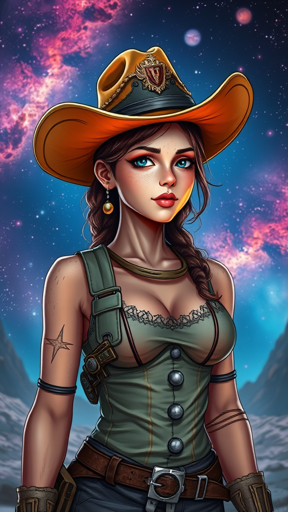 A stunningly detailed female space cowboy standing confidently on an alien planet, wearing a classic cowboy hat. Her skin exhibits intricate textures, adorned with subtle yet vivid gradient colors. The background reveals a captivating galaxy, filled with stars and cosmic wonders reminiscent of the Borderlands style. The atmosphere around her is volumetric, creating an ethereal ambiance. She is accessorized with earrings and is smudged with the dirt of her travels across the universe. Her eyes portray determination and adventure. The image is framed like a trading card, highlighting her iconic presence. Despite the futuristic setting, her outfit echoes traditional western attire, complete with holstered pistols. The scene is captured with HDR quality and cel shading, ensuring every detail is sharp and vibrant without any intrusive elements like watermarks or signatures interfering with this otherworldly portrait.