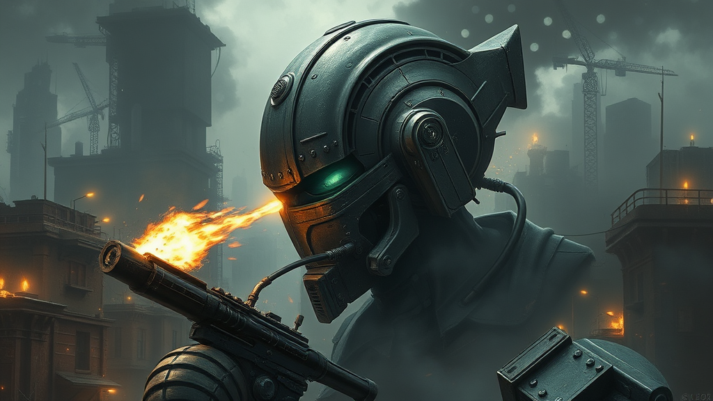 A stunningly detailed head with a streamlined shape in the style of Kou Yokoyama, set in a dieselpunk environment. The scene captures combat action within a ruined city, enveloped in a retro-futuristic aesthetic. Intricate mechanisms and vintage elements create a rich atmosphere, layered with smoke and dark gray hues for a dramatic effect. Realism is achieved through complex details, rendered in a three-quarter view, with light emanating from multiple sources. The cinematic composition is enhanced by natural textures and reflections, as well as cinematic lighting. This digital painting embraces the chaos of the setting, adding subtle creative touches to the combat narrative while maintaining the primary theme. The artwork merges elements of realism and artistic expression, presenting a vivid portrayal of a dystopian landscape.