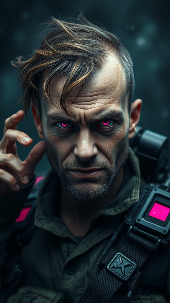A stunningly detailed hyperrealistic scene unfolds in a dark, stormy environment, where technology melds with nature. A furious and disheveled soldier stands in the foreground, his clear eyes and striking pink irises reflecting a range of emotions. His appearance is both gorgeous and intense, with a touch of madness in his smooth features. The colors around him shimmer subtly, reminiscent of a muted rainbow. Despite his anger, there is a surprising smile on his face, adding an element of absurdity to the moment. His expression is a cocktail of surprise and embarrassment, captured in ultra-realistic photography that highlights every detail. The setting feels as if it were an old painting brought to vivid life, with textures and details that are almost tactile. However, there are elements out of place: extra fingers and slightly mutated hands peeking from the edges, as if reality itself were glitching. Shadows dance wildly around him, casting deep contrasts, while nearby objects possess grossly disproportionate forms. A blend of hyperrealism and surrealism creates an entirely unique visual experience.