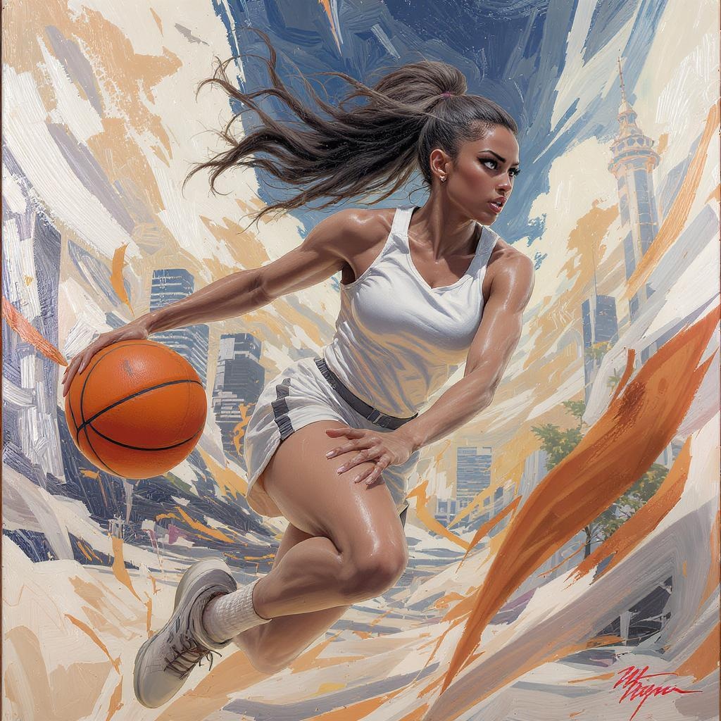 A stunningly detailed painting of a woman gracefully dribbling a basketball, capturing the fluid motion and intensity of her focus. Her dynamic posture and flowing hair convey a sense of energy and movement. The vivid colors and play of light create a captivating atmosphere, with the background offering an abstract cityscape reminiscent of Makoto Shinkai's atmospheric skies. The intricate brushwork and expressive detailing reflect the styles of Conrad Roset and Greg Rutkowski, blending soft, organic forms with striking, bold lines. This masterpiece exudes a sense of power and elegance, making it a standout piece on ArtStation, resonating with a wide audience, highlighting both the grace and strength of the athlete in her element.