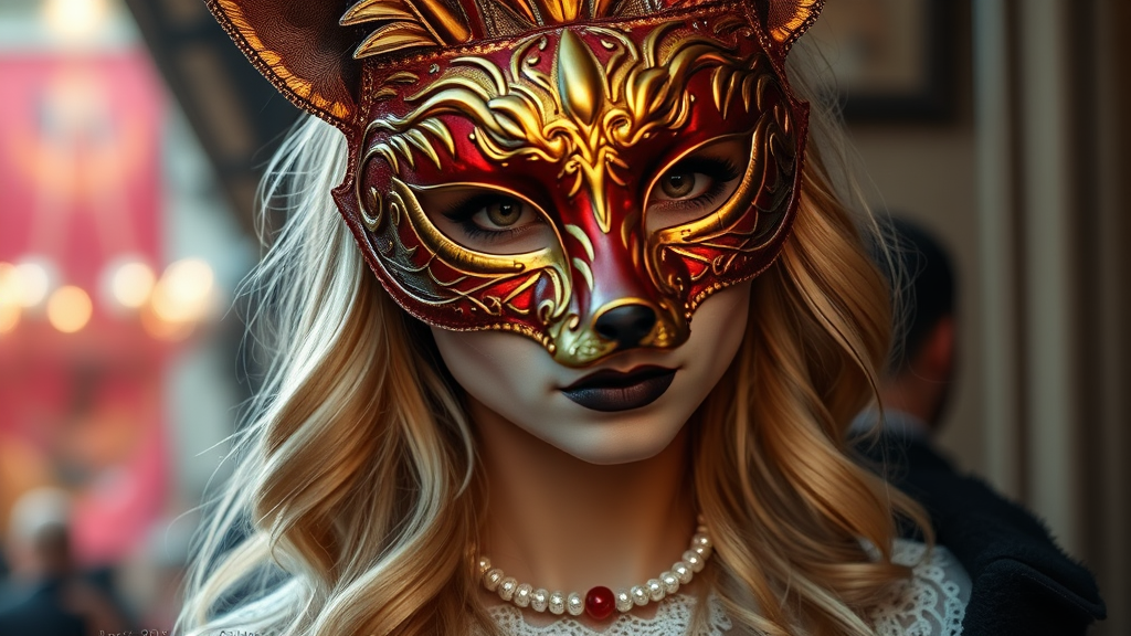 A stunningly detailed, photo-realistic 4k portrait oil painting of a woman at the Venetian Carnival. She dons an intricately designed fox mask that shimmers with hints of gold and crimson. Her blonde hair cascades elegantly over her shoulders, catching the ambient light to reveal soft waves and subtle highlights. The background is a rich tapestry of blurred colors, echoing the enchanting atmosphere of the carnival. The woman's eyes, visible through the mask, are vivid and expressive, capturing a moment of mysterious allure. Her attire is adorned with delicate lace and pearls, adding layers of texture and depth to the painting.