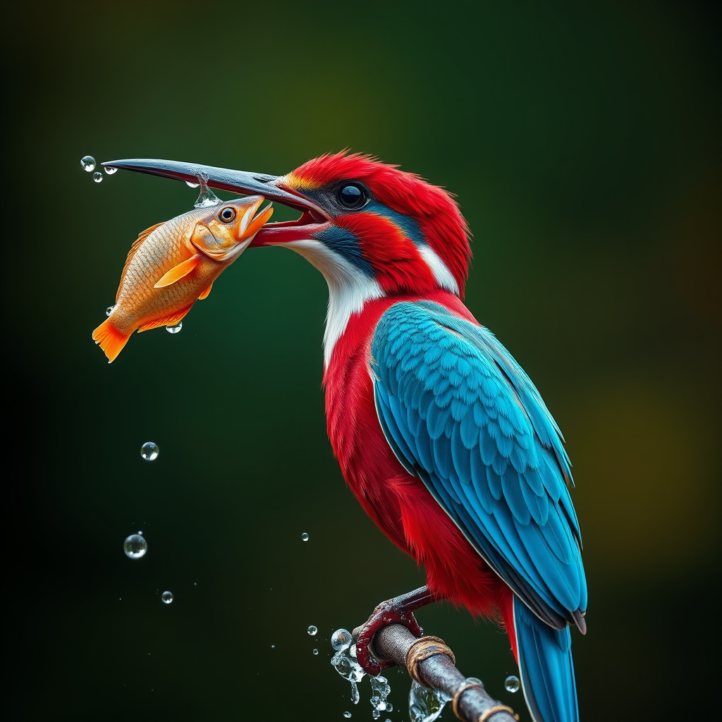 A stunningly detailed photograph of a vibrant kingfisher snatching a fish in its beak, set against a backdrop of warm, dramatic lighting. The scene captures the vivid red and blue plumage of the bird and the splash of water droplets in the air, shot with an 85mm lens to emphasize the crisp detail and depth, in a 4:3 aspect ratio with an enhanced sense of cinematic realism.