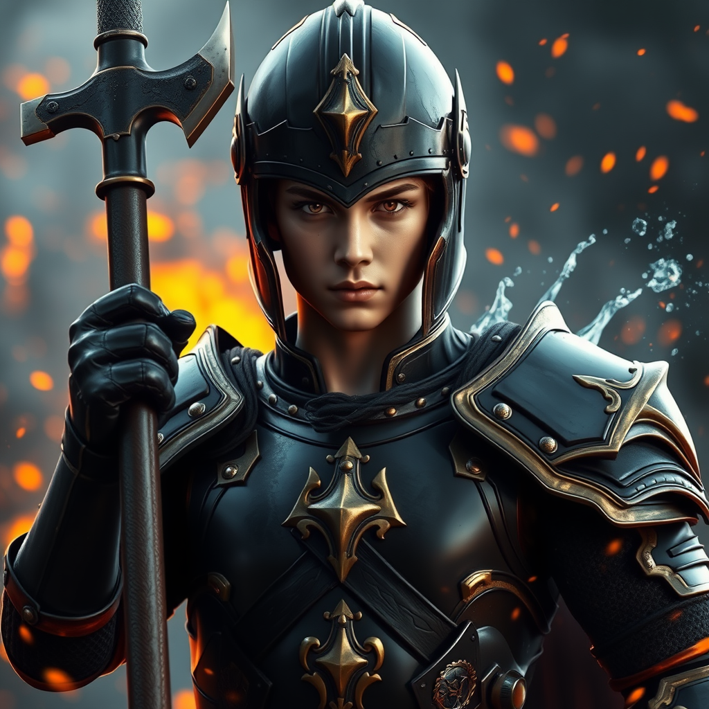 A stunningly detailed, photorealistic image depicts a young male warrior clad in sleek black armor with intricate golden trim. His helmet, matching the armor, hints at strength and mystery, yet his face is uncovered, revealing youthful handsomeness and an intense gaze that meets the viewer's eyes. The concept layers high-definition artistry inspired by renowned artists, embracing the quality of DeviantArt and ArtStation standards. In this vibrant, high fantasy scene, cinematic lighting and ray tracing techniques work seamlessly to create an ultra-realistic, 12k resolution image that's both captivating and award-worthy. The warrior stands poised in an action pose, his hands raised to a fierce 90-degree angle as he grips a formidable battle axe. Around him, the backdrop weaves a thrilling blend of embers and mist, accented by dynamic water splashes. The design avoids overt nudity and ensures each element—from the striking folds of his armor to the heroic stance and perfectly rendered facial details—creates an immersive, powerful, and seamless visual narrative.