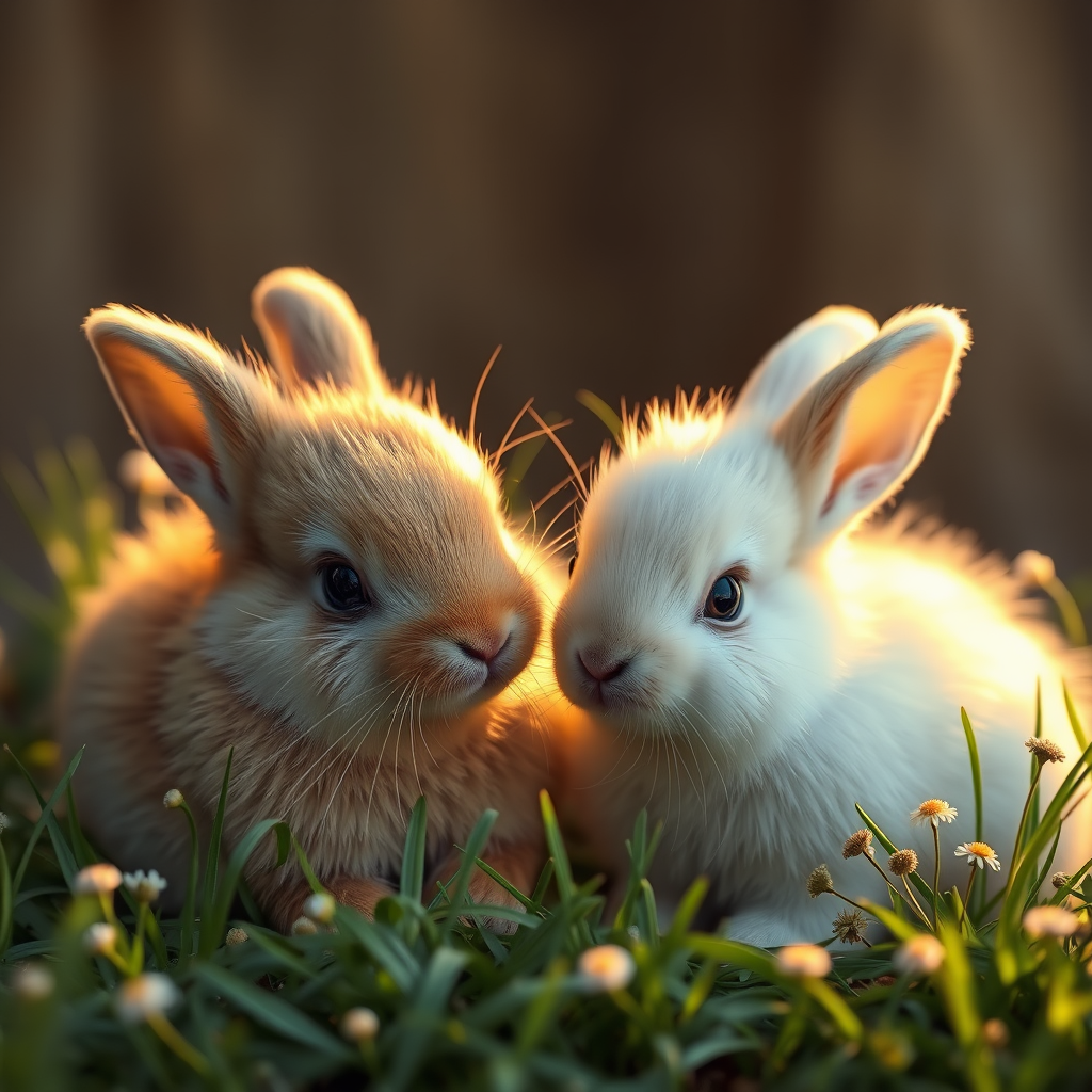 A stunningly detailed, photorealistic scene featuring two baby rabbits in a tender moment, nestled against a backdrop with cinematic lighting that casts a warm, golden glow. One rabbit is a soft, light brown with velvety fur catching the light in delicate hues, while the other is a pristine white, its fur appearing almost luminous. Surrounding the rabbits are gentle tufts of green grass, speckled with tiny wildflowers, adding an enchanting touch to the serene setting. The atmosphere is tranquil and intimate, capturing a fleeting moment of pure affection.