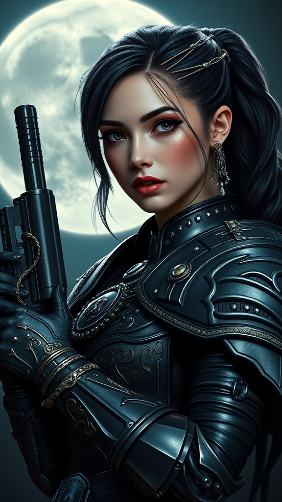 A stunningly detailed portrait of a woman inspired by Tifa Lockhart, wearing ornate armor adorned with jewels in a Warhammer 40k Adepta Sororitas style. Her face is beautifully intricate with a touch of blush and pink eyeshadow, complemented by a ponytail. She holds a gun, standing confidently in front of a full moon, with cinematic chiaroscuro lighting highlighting her features. Her expression is soft yet fierce, capturing a sense of elegance and strength. The scene is intricately designed, evoking a sense of fantasy and allure with fashion portrait elements. The overall composition balances realism with a stylized approach, maintaining clarity and aesthetic appeal.