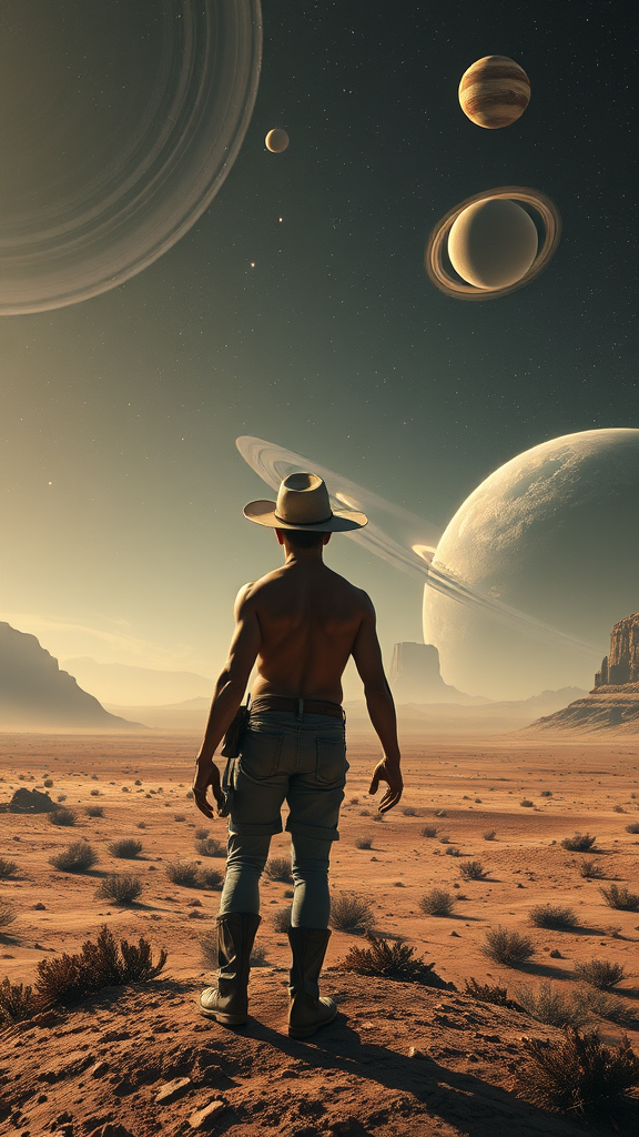 A stunningly detailed portrait of an expansive alien landscape featuring a space cowboy gazing at the stars, with planets dramatically colliding in the sky. The scene is rendered in 8k with extreme detail and photorealism, capturing dirt particles and cinematic lighting in a masterful composition. The sky is adorned with planetary rings, while subtle imperfections like low resolution and visual distortion add depth. The cowboy exhibits a unique physique, adding character to the scene with creatively imperfect anatomy. Textural details like jpeg artifacts, a faint signature, and a semi-blurry finish give the image a raw, authentic feel. The background captures hints of otherworldly flora, while the cowboy's form blends elements of human and extraterrestrial; limbs and features may appear surreal or exaggerated, further emphasizing the fantastical nature of this vision. Illusions of multiple limbs and features enhance the dreamlike atmosphere, setting the stage for a cinematic spectacle that pushes the boundaries of imagination.