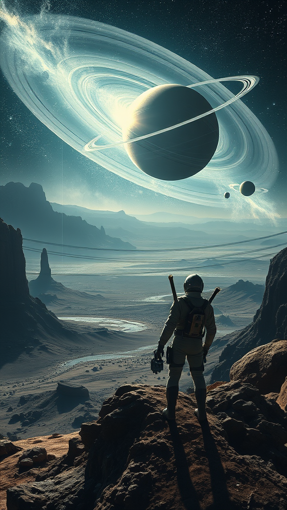 A stunningly detailed portrayal of an expansive alien landscape with a cosmic cowboy gazing at the stars; planets in the sky are caught mid-collision, captured in 8k with extraordinary detail and photorealism. The scene is enhanced with dust particles and cinematic lighting, resulting in a breathtaking, expertly crafted masterpiece. Rings of planets sweep across the sky. Despite elements of surrealism - unexpected features like distorted anatomy, extra digits, misplaced limbs, and a scattering of jpeg artifacts - the image emanates a peculiar charm. Hints of text, faint watermarks, and blurry signatures add layers of intrigue, while the form of the space cowboy suggests motion amidst the extraterrestrial vista. Even amid these artistic anomalies, where too many limbs and eyes create a fantastical vision, beauty emerges in the chaos, presenting a uniquely captivating spectacle.