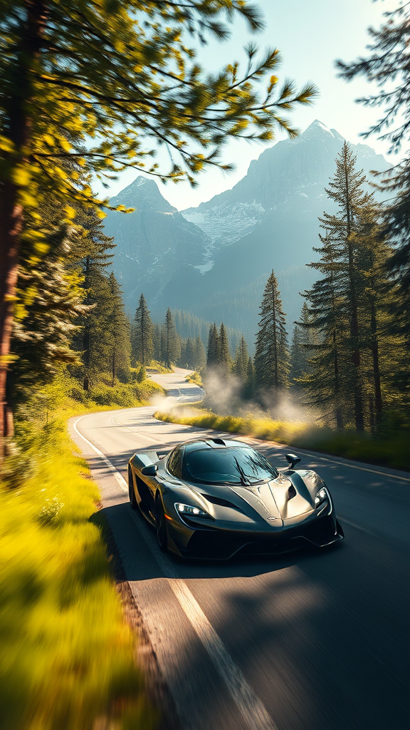 A stunningly detailed ultra-realistic photograph featuring a sleek hypercar speeding along a winding forest road, with majestic mountains towering in the background. The scene is captured in mesmerizing 8K resolution, boasting vibrant HDR colors and exquisite 4K ultra detail. The sunlight filters through the canopy, casting dappled shadows on the car's gleaming surface. Lush greenery frames the road, adding depth and contrast to the rugged mountain peaks in the distance. Light mist clings to the forest floor, enhancing the sense of speed and serenity in this tranquil yet exhilarating landscape.
