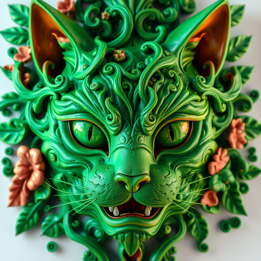 A stunningly detailed, vividly colorful and incredibly intricate decorative mask sculpted in the form of a cat's face, featuring lush green hues, adorned with twisting foliage and delicate, flowing lines. This abstract and psychedelic 3D artwork captures the viewer's eye with its mesmerizing design, showcased in an ultra-high-definition close-up resembling a work of art you might find on ArtStation.