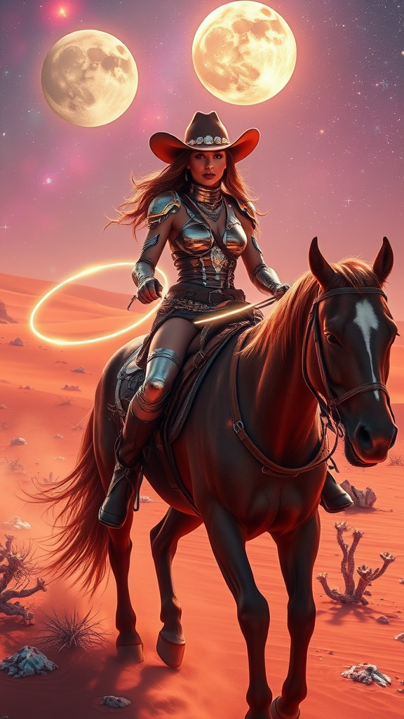 A stunningly elegant space cowgirl, adorned in a futuristic yet rustic ensemble, rides a sleek, cyber-enhanced steed through a vibrant and sprawling cosmic desert. The scene blends elements of the wild west and a sophisticated space age, capturing an atmosphere rich with glowing nebulae and distant stars. The cowgirl's attire sparkles with interstellar patterns and glows softly under the ethereal light of twin moons. Her eyes, bright and determined, mirror the vastness of space around her. The hyper-detailed landscape reveals glittering minerals in the sand and peculiar, alien vegetation that sways gently in an otherworldly breeze. Her holographic lasso loops effortlessly from her saddle, trailing luminescent trails, as she navigates the untamed frontier of this new, uncharted planet with grace and poise. The entire scene is depicted with impeccable realism and vivid detail, capturing the spirit of adventure and the allure of the unknown.