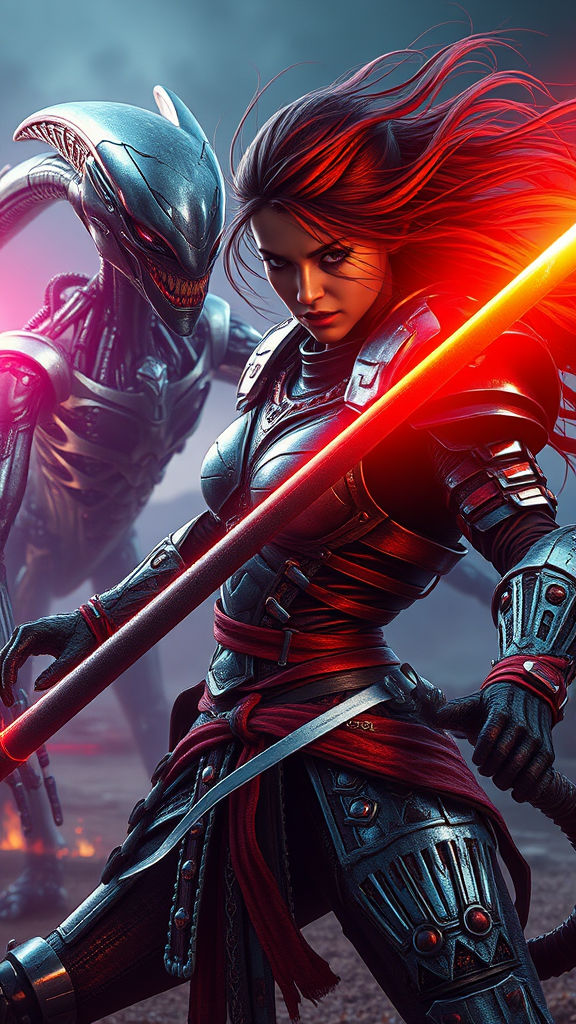 A stunningly fierce warrior woman clad in intricately detailed armor engages in battle with a menacing cyborg alien. The scene is captured in hyper-stylized concept art featuring highly realistic textures and dynamic, colorful cinematic lighting that casts dramatic shadows across the combatants. The warrior’s flowing hair catches the vivid light, adding a sense of movement, while the alien's metallic exoskeleton reflects vibrant hues. The background depicts a futuristic landscape infused with an eerie glow, enhancing the epic atmosphere of the confrontation.