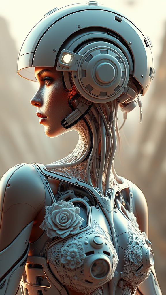 A stunningly intricate 3D render of a beautiful porcelain profile of a female android, full body cyborg with visible robotic parts, captured in exquisite detail at 150 mm. The scene is bathed in soft studio lighting, accompanied by a striking rim light enhancing vibrant features. This luxurious cyberpunk illustration showcases the android adorned with lace, presenting a hyperrealistic depiction complete with exposed anatomical features and facial musculature, intricately interwoven with electric cables and microchips. It embodies elegance against a captivating background, rendered in an H. R. Giger style using octane render technology at 8k resolution, achieving masterpiece quality. The image offers an immersive artistic experience, with finely detailed, high-resolution CG art suited for unity wallpapers. This masterpiece encapsulates absurdly rich details, presenting a futuristic robot with a silver helmet, depicted in a seated posture. The artwork exudes the charm of sepia painting and sketch influences, avoiding low-resolution and common artistic faults, embracing refined creativity while maintaining its conceptual essence.