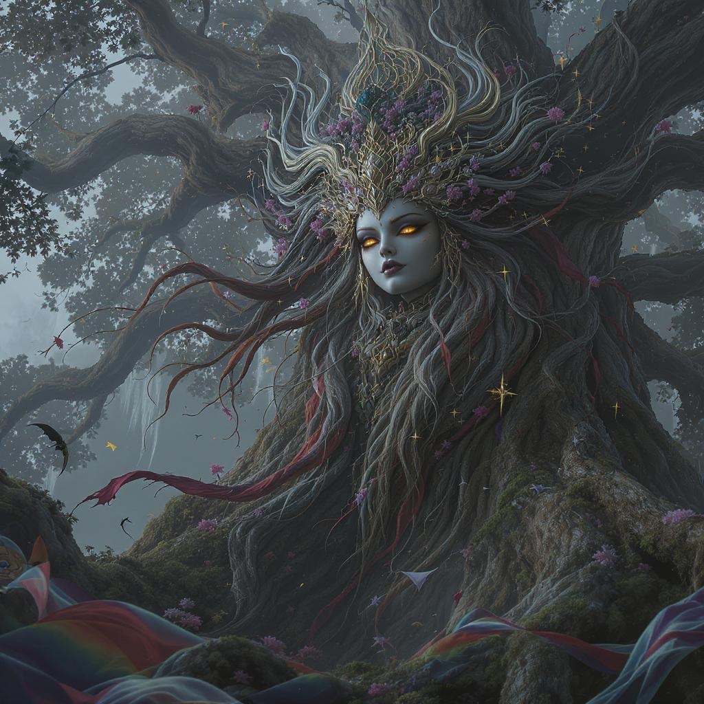 A stunningly intricate hyper-maximalist depiction of a cinematic forest deity with elaborate, floral elements woven into flowing, ethereal hair, reminiscent of a Magic the Gathering character. Set against the majestic backdrop of a colossal ancient tree, the deity strikes a breathtaking pose, embodying both grace and power, as if brought to life by the artistry of MountainDog Studios. Rendered in the Unreal Engine, the scene is bathed in intense lighting and dramatic shadows, interplaying with touches of orthodox symbolism that add layers of depth and meaning. The ambient atmosphere is palpable through the realism of ambient occlusion techniques, capturing raw emotion and spiritual resonance, all brought to life in breathtaking 8k resolution, with an aspect ratio of 2:3. Creative elements include subtle additions of surreal flora, intertwining the deity's essence with nature itself, while hints of mystical symbols are woven into the scene, enhancing the overall storytelling and visual splendor.