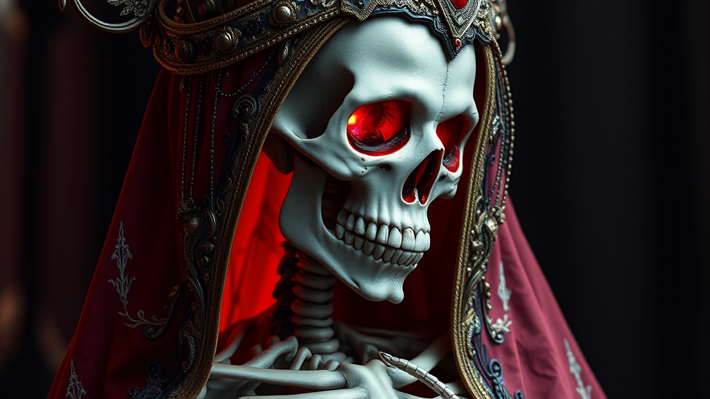 A stunningly intricate skeleton woman draped in regal attire, embodying the queen of the underworld, with vibrant colors surrounding her eye sockets, hollow yet expressive. Her presence is both living and dead, rich with blood and veins beneath intricate detailing. Positioned sideways, her morbid yet majestic appearance tells a fantastical tale. The imagery is hyper-realistic and cinematic, capturing an unholy elegance in UHD resolution, with 8k HDR quality, stunning octane render. Absurdly detailed, while avoiding imperfections such as anatomical anomalies or missing limbs, ensuring a flawless portrayal of a living dead fantasy figure.