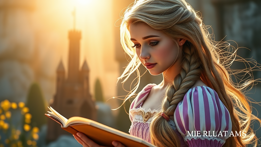A stunningly lifelike depiction of Rapunzel, resembling a real girl with an intricate braid, capturing her enchantingly as she sketches her tower under the warm glow of natural sunlight, ultra realistic 8k resolution, embodying photorealism with an epic composition, her expression one of focused creativity, surrounded by a gentle breeze that softly tousles the pages of her sketchbook, adding dynamic movement to the serene scene.