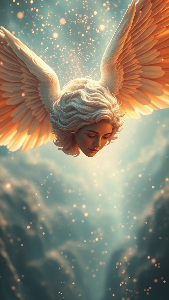 A stunningly lifelike image capturing a celestial being with majestic wings descending gracefully from the heavens, enveloped in an ethereal glow. The figure is surrounded by shimmering, magical particles that create a dreamy and fantastical atmosphere, reminiscent of a D&D universe. The wide-angle perspective showcases a detailed background, enhancing the sense of wonder and fantasy. The being's face is intricately detailed, exuding a sense of calm and divinity, and is painted with the finesse of professional digital artists, akin to those featured on ArtStation. The artwork is infused with soft pastel colors and embodies the photorealistic quality reminiscent of master artists like Artgerm, Greg Rutkowski, Alphonse Mucha, Loish, and WLOP. Captured in crisp 8k resolution, the lighting adds depth and realism, making it a trending piece on platforms like Tumblr. The scene avoids distracting elements and instead focuses on the seamless beauty and harmony of the divine figure in flight.