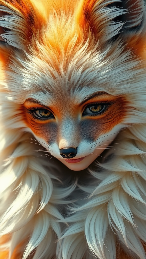 A stunningly lifelike portrait of a fluffy nine-tailed fox girl, capturing the ethereal essence in the style of Wlop and Guweiz, with hyper-realistic details and professional-grade clarity. The image is rendered in 8k resolution, showcasing her captivating features under soft natural lighting that highlights the delicate textures of her silky fur and intricate details of her gentle expression. Her eyes, filled with mystery and wisdom, are framed by elegant whiskers and subtly sharpened ears, blending the surreal and the real in a mesmerizing harmony.