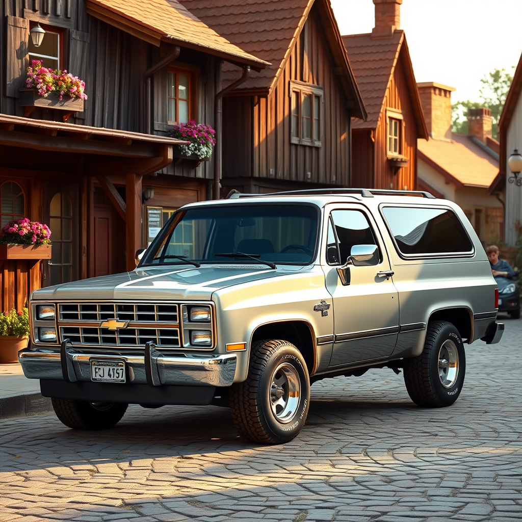 A stunningly photorealistic depiction of a polished Silver 1987 Chevrolet Blazer K5 parked in a quaint village setting bathed in the warm glow of the midday sun, featuring ultra-fine details against the backdrop of rustic wooden cottages and cobblestone paths, with vibrant flower boxes under windows and children playing in the distance, capturing the essence of cinematic 8K resolution, the image composition balanced to highlight the Blazer's classic design in harmony with the charming rural landscape.
