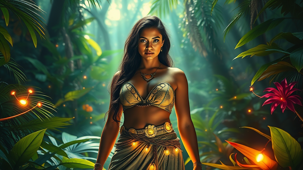 A stunningly powerful Amazonian woman stands confidently amidst a vibrant jungle scene, her presence illuminated by ethereal fairy lights that dance around her. The scene is captured in exquisite photorealistic detail, with bright, vivid colors that bring the entire landscape to life. Volumetric rays of light filter through the dense canopy, casting an enchanting glow that highlights her formidable figure. Her eyes gleam with determination, and her flowing attire echoes the lush flora surrounding her. The image is rendered in high dynamic range, emphasizing the intricate textures and depth of this breathtaking tableau.