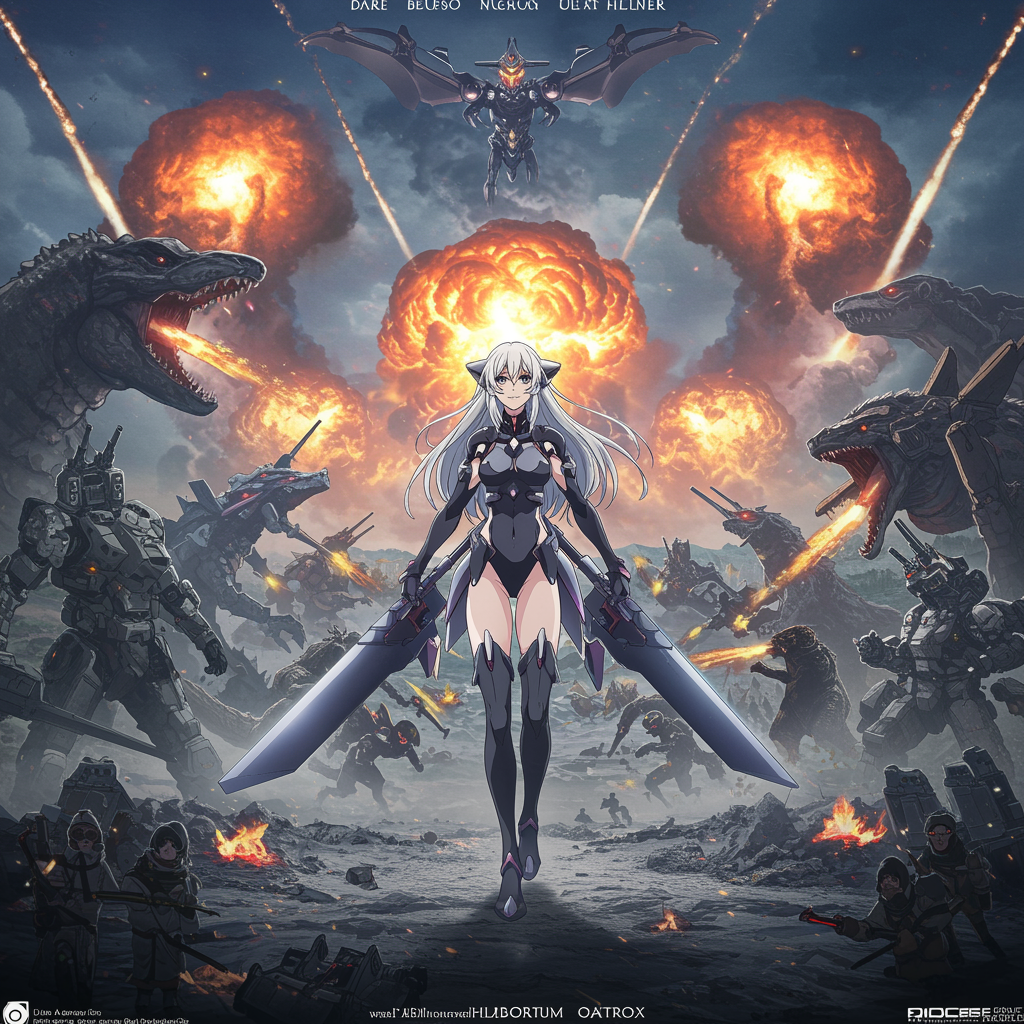 A stunningly powerful Anime Girl, envisioned by the creative minds of Hideaki Anno, Katsuhiro Otomo, and Rumiko Takahashi, stands at the center of an epic movie poster, heralded as a box office sensation and a storytelling masterpiece. She is the focal point, her presence commanding and magnetic. Surrounding her, colossal monsters and formidable mech creatures are enmeshed in fierce combat, their monumental clashes sending shockwaves through the landscape. Overhead, nuclear explosions cast hauntingly beautiful hues across the sky, each detail rendered in exquisite clarity, evoking a sense of awe and intensity. The scene is captured in vivid 8k resolution, emphasizing the intricate intricacies of a world on the brink of chaos but held together by the power and resolve of the central heroine.