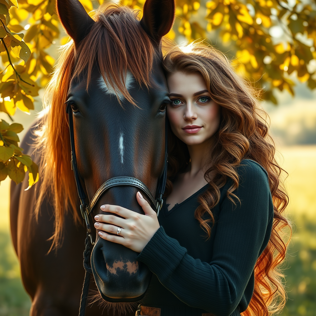 A stunningly realistic 22-year-old woman with flowing, slightly curly, auburn hair stands in gentle harmony with a majestic horse. Her emerald green eyes reflect warmth and kindness as she tenderly holds the horse's muzzle. Sunlight filters through the autumn leaves, casting a golden glow around them, enhancing the serene connection between the woman and her faithful companion. The scene is set in a tranquil meadow, where the soft rustling of leaves complements the peaceful moment, creating an idyllic portrait of natural beauty and companionship.