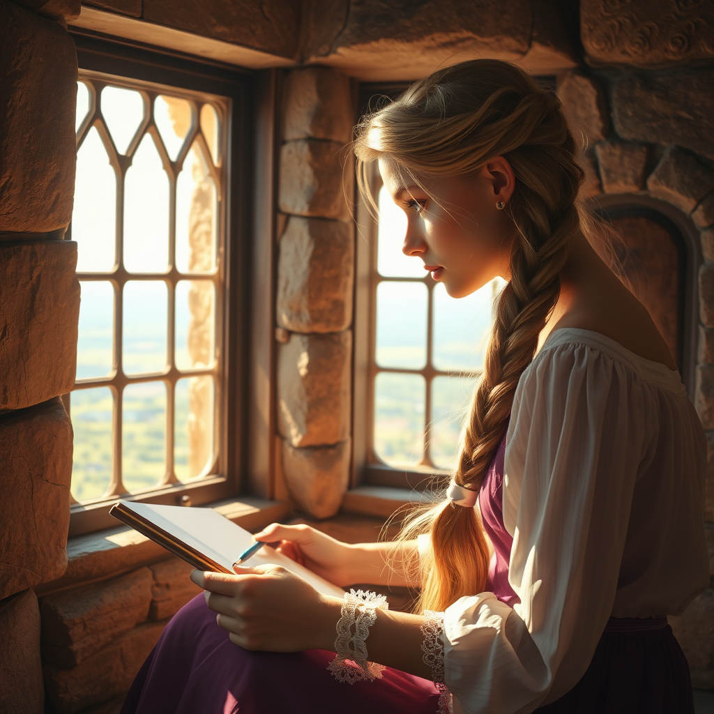A stunningly realistic depiction of a girl reminiscent of Rapunzel from Tangled, with a long, intricate braid cascading down her back. She is sitting by a large window in her tower, bathed in warm, natural sunlight that highlights her delicate features and the vibrant colors of her surroundings. The scene captures her focused expression as she sketches the view outside, blending beauty and creativity. The intricate details of her drawing tools are visible, while the tower's stone interior adds a touch of rustic charm. The composition is both epic and intimate, resembling a masterpiece in its photorealistic quality, with an incredible 8k resolution that captures every nuance of light and shadow.