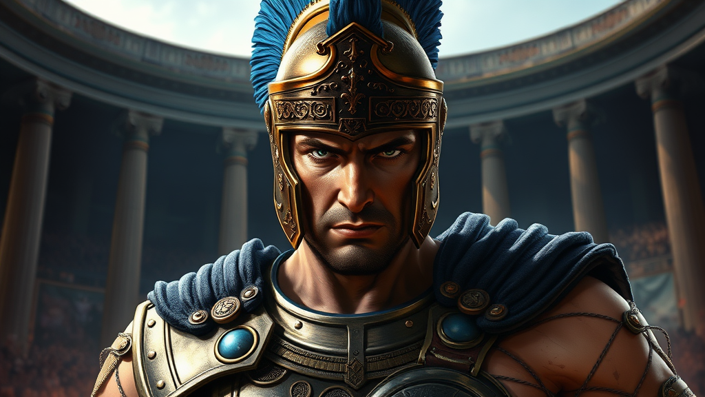A stunningly realistic digital illustration depicts a Roman gladiator in a commanding, intense stance, his gaze locked with the viewer. The gladiator wears a traditional galea helmet, adorned with elaborate engravings and a rich azure plume. His powerful physique is clad in lorica segmentata armor, embellished with intricate designs and a metallic shimmer. His eyes shine with a fierce, resolute light, embodying bravery and strength. The background features a dimly lit arena, where the shadows of a crowd and ancient architecture subtly enhance the dramatic and powerful scene.