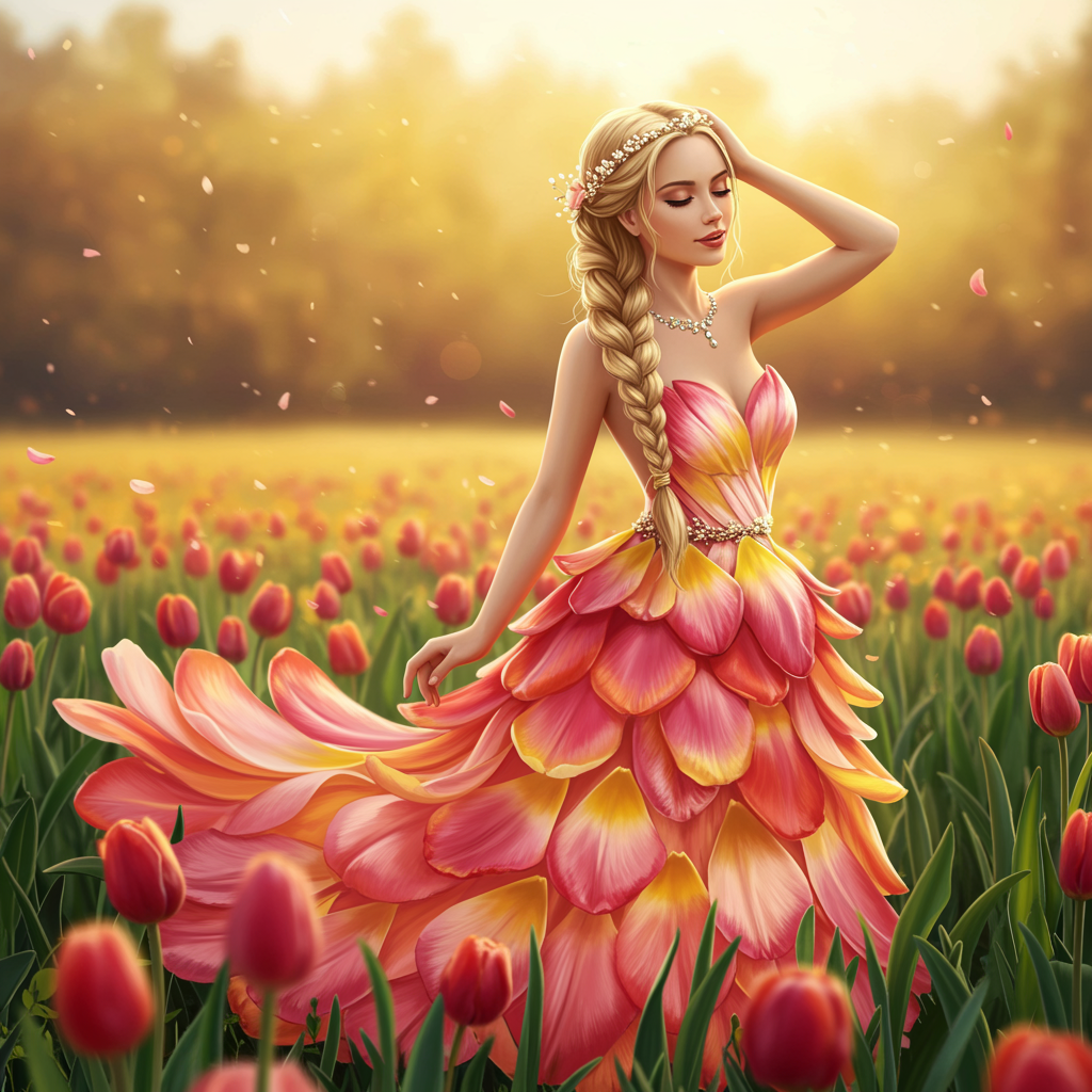 A stunningly realistic digital painting depicts a beautiful blonde woman with a cascading braid, adorned in an exquisite dress crafted entirely from vibrant tulip petals. Intricate patterns and shimmering accents enhance the design, which flows gracefully around her slender figure, highlighting her delicate waist and softly draped neckline. She stands in an enchanting meadow, where the sun casts a warm golden hue over her and the blooming landscape. Her radiant smile, paired with her bohemian-inspired attire, creates an elegant and captivating image that sparks the viewer's imagination.
