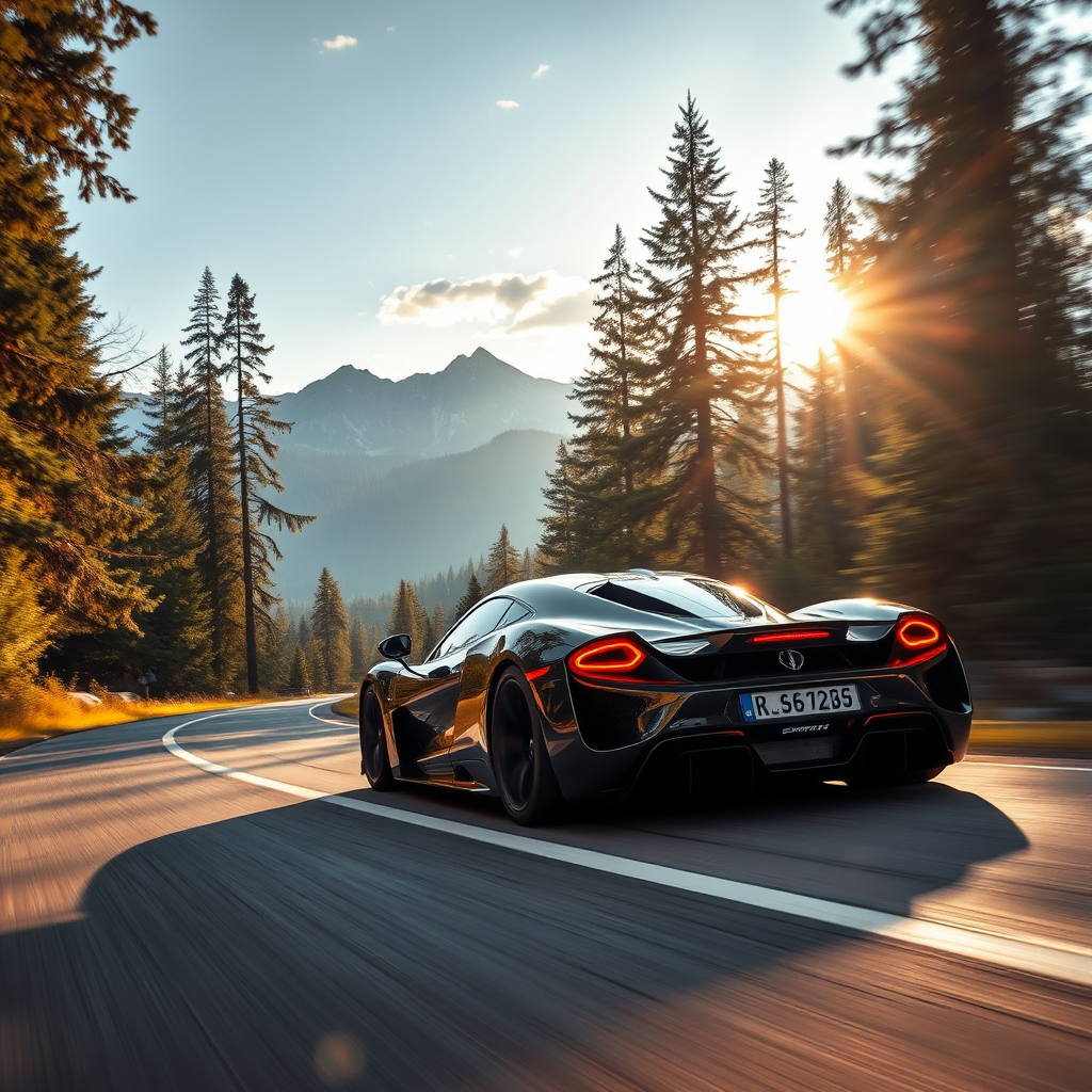A stunningly realistic image of a hyper car blazing down a winding forest road, its sleek design glistening under dappled sunlight, framed by towering trees and majestic mountain peaks in the distant background. Captured in ultra-high-definition 8K with HDR precision, the vivid details showcase the intricate textures and dynamic reflections on the car's surface, enhancing the scene's natural allure. The setting sun casts warm hues across the landscape, highlighting the serene beauty of nature contrasted with the car's modern elegance.