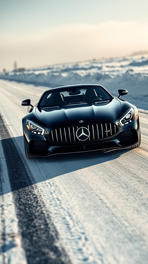 A stunningly realistic luxury black Mercedes sports car elegantly glides along a snow-covered highway, its sleek design contrasting sharply with the pristine white landscape, the icy wind swirling around its polished frame as the sun reflects off its chrome details.